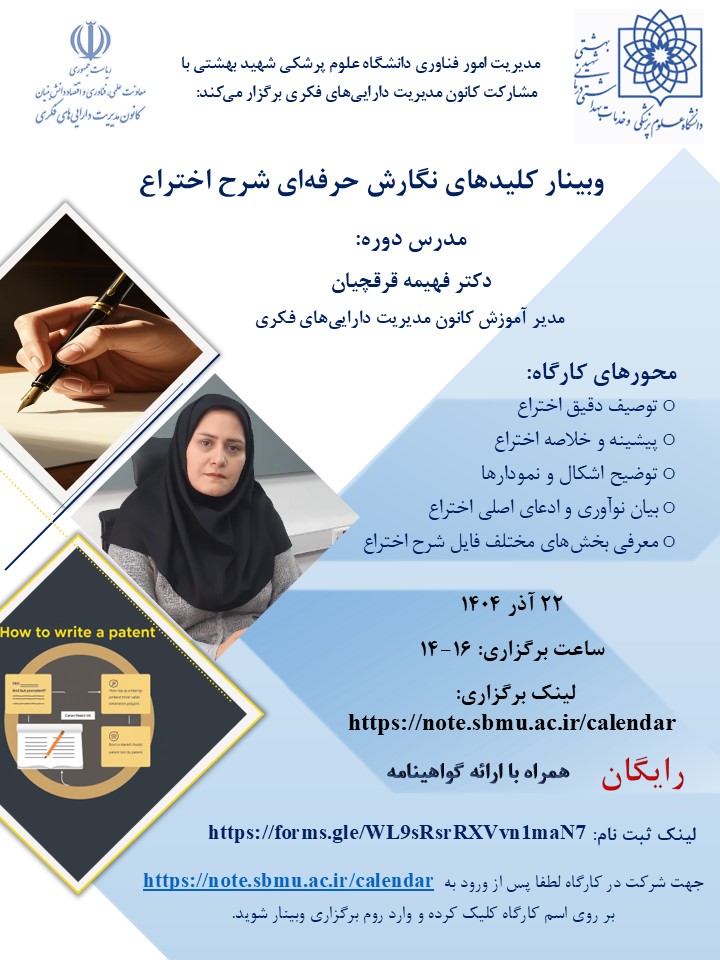 برگزاری وبینار آشنایی با نگارش حرفه ای شرح اختراع تاریخ انتشار : 1404/09/16 - 07:18 بازدید : 14 تعداد بازدید : 12 کد خبر : 164884 گروه خبری : گروه های مطالب,آرشیو اخبار تعداد نظرات : 0